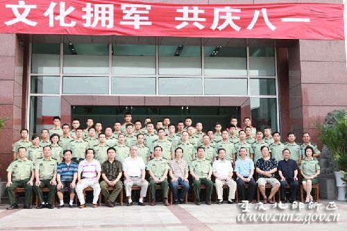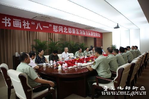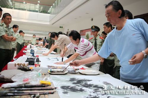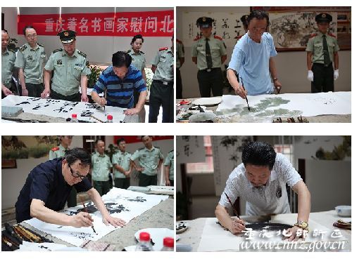 翰墨飘香,鱼水情深。7月22日下午,重庆市著名书画家来到北部新区支队,开展了以“文化拥军、共庆八一”为主题的系列活动。在市书画社社长王明福的带领下,李鲁、何国胜、刘忠义等9位著名书画家怀着对消防官兵的深情厚谊和美好祝愿走进警营,饱蘸激情地为官兵现场挥毫泼墨,以此共庆建军84周年,讴歌消防精神和光辉业绩。市消防总队政委张剑明少将,副政委崔春起大校等领导参加了活动。